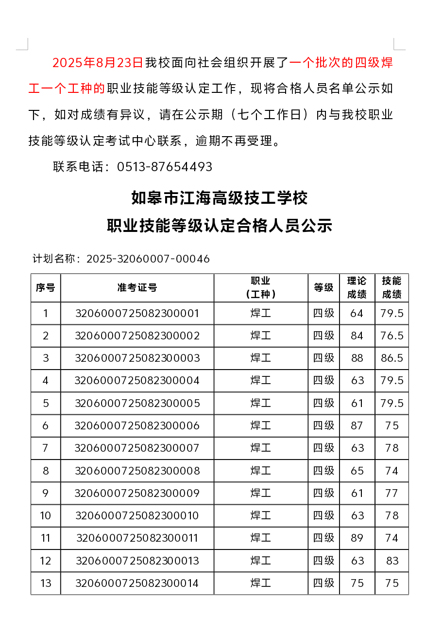 2025-32060007-00046批次職業(yè)技能等級認定合格人員公示