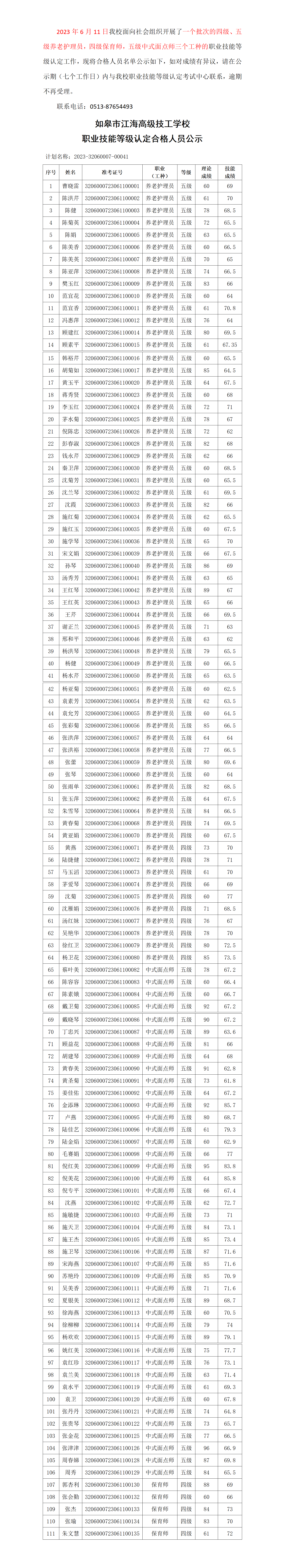 2023-32060007-00041批次職業(yè)技能等級(jí)認(rèn)定合格人員公示