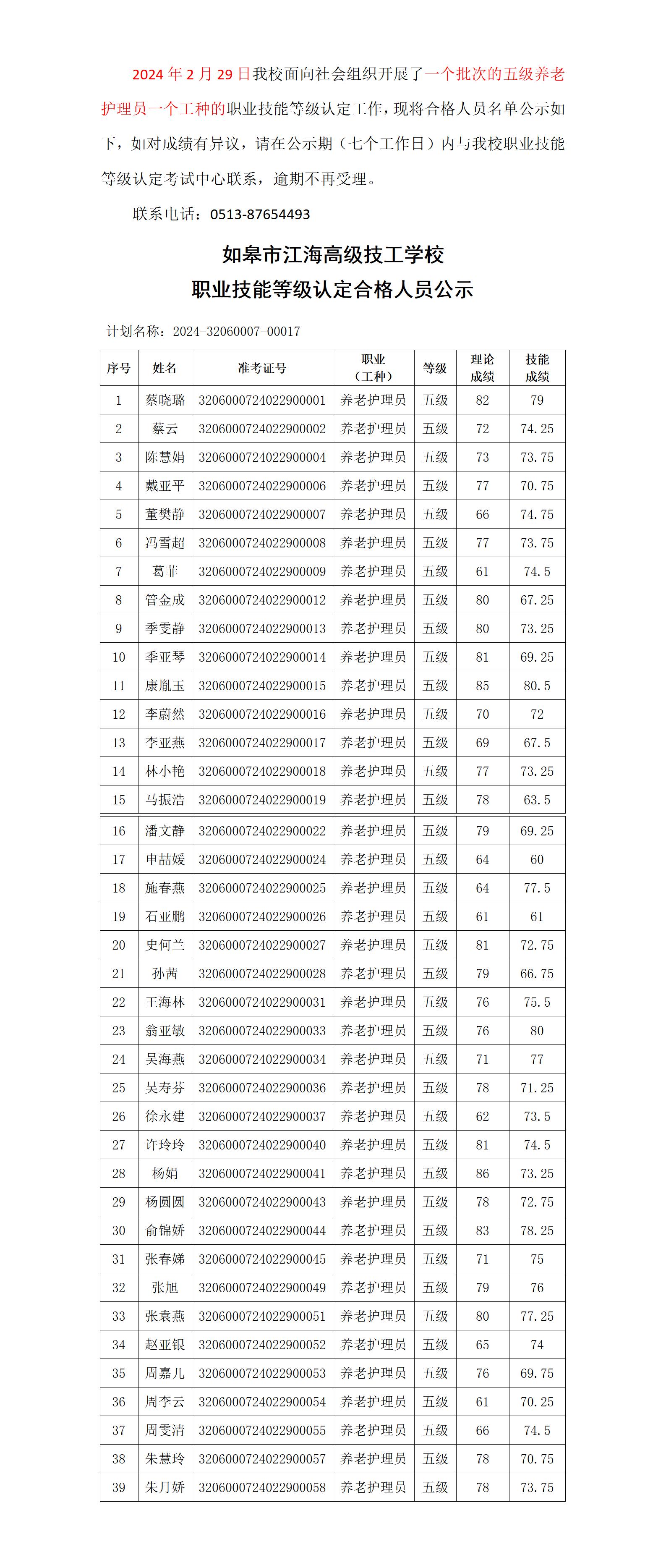 2024-32060007-00016批次職業(yè)技能等級(jí)認(rèn)定合格人員公示