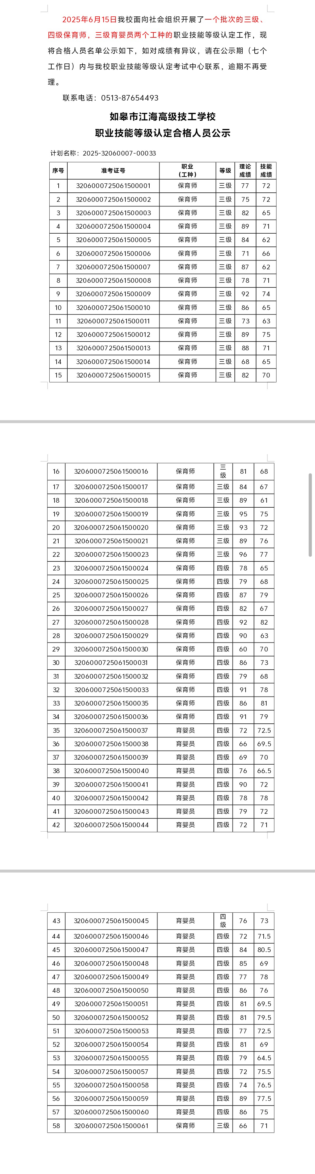 2025-32060007-00033批次職業(yè)技能等級(jí)認(rèn)定合格人員公示