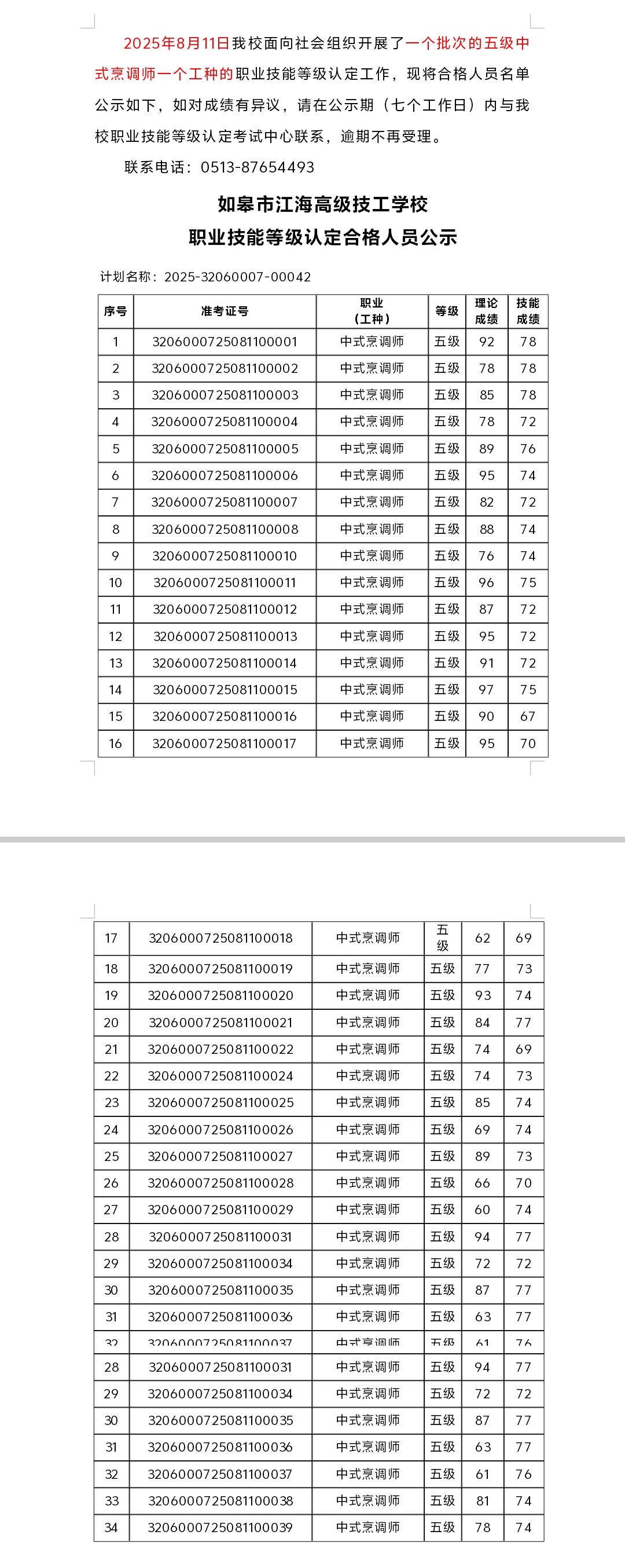 2025-32060007-00042批次職業(yè)技能等級(jí)認(rèn)定合格人員公示
