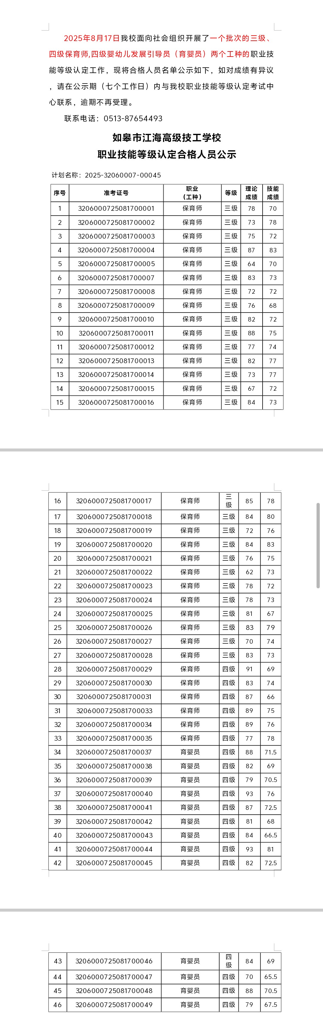 2025-32060007-00045批次職業(yè)技能等級(jí)認(rèn)定合格人員公示