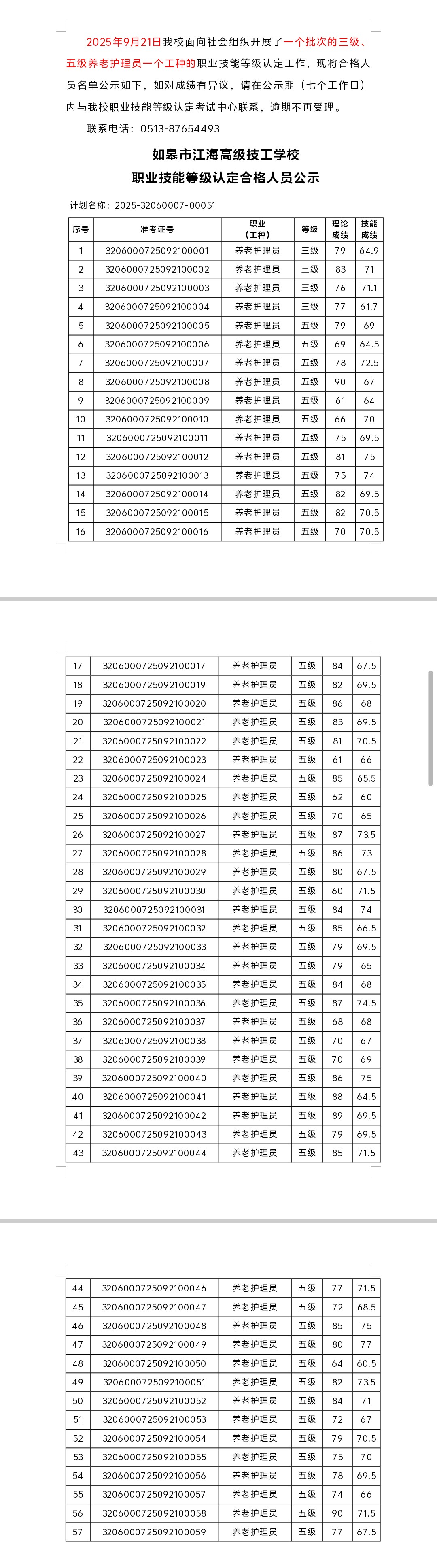 2025-32060007-00051批次職業(yè)技能等級(jí)認(rèn)定合格人員公示