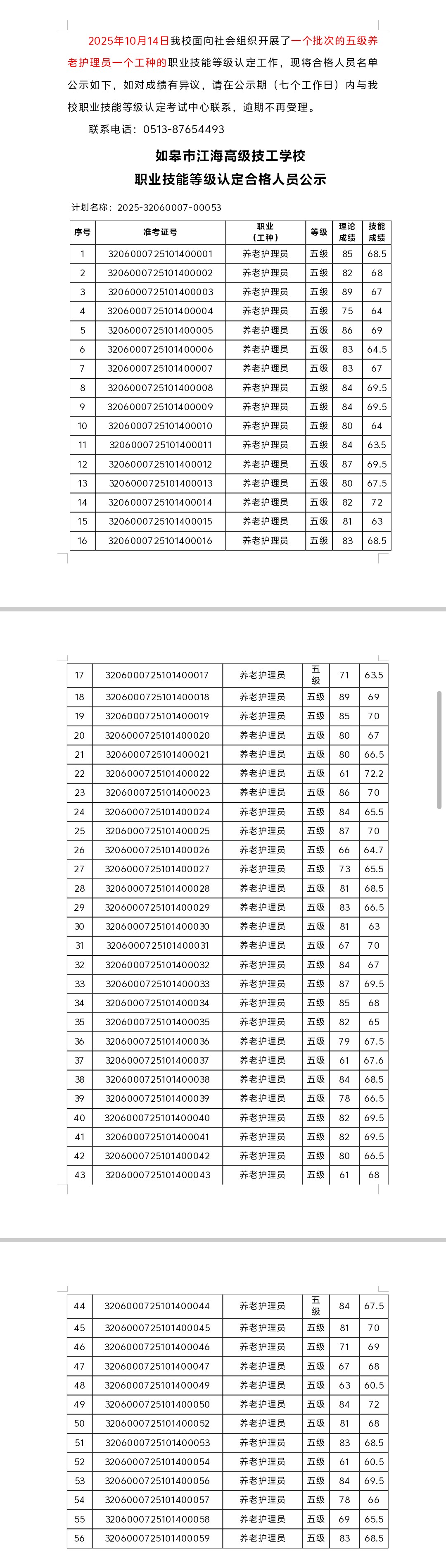 2025-32060007-00054批次職業(yè)技能等級(jí)認(rèn)定合格人員公示