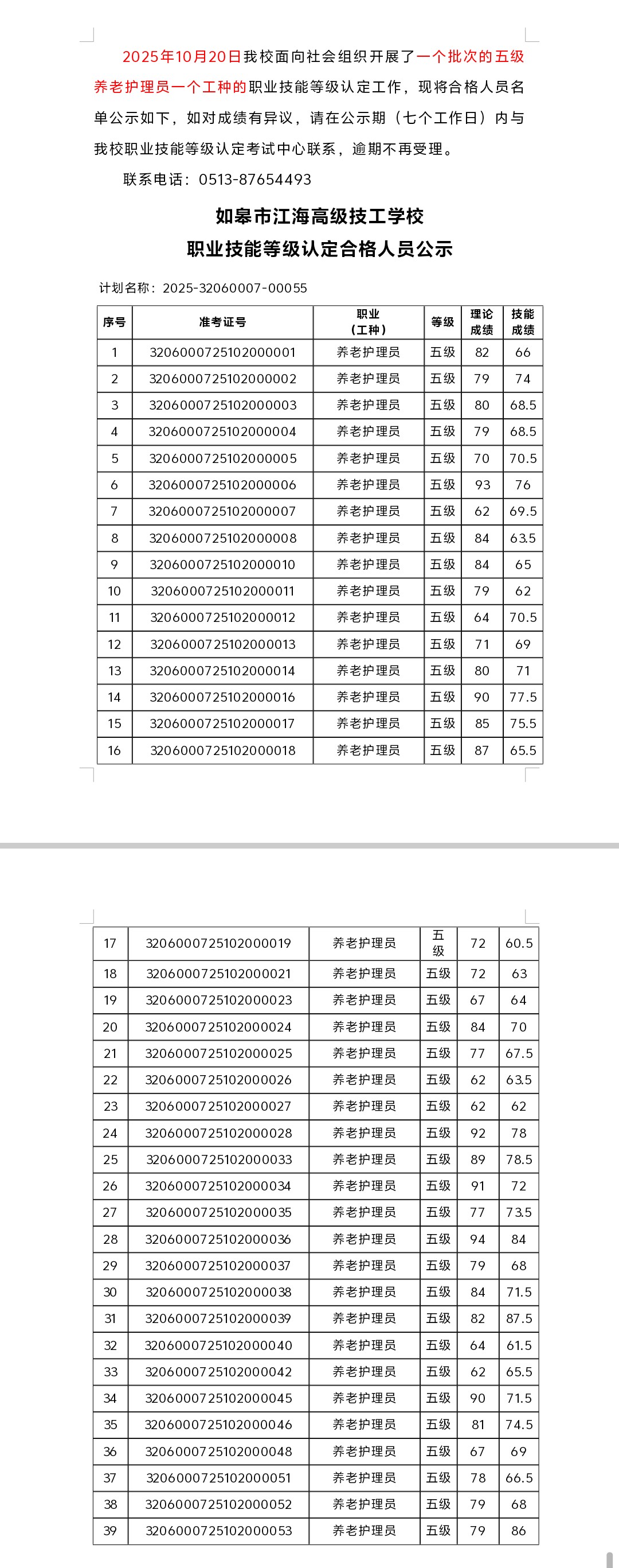 2025-32060007-00054批次職業(yè)技能等級(jí)認(rèn)定合格人員公示