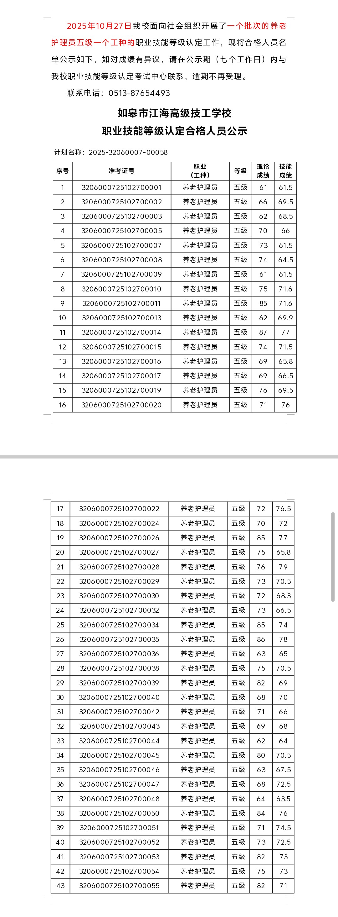 2025-32060007-00065批次職業(yè)技能等級認定合格人員公示