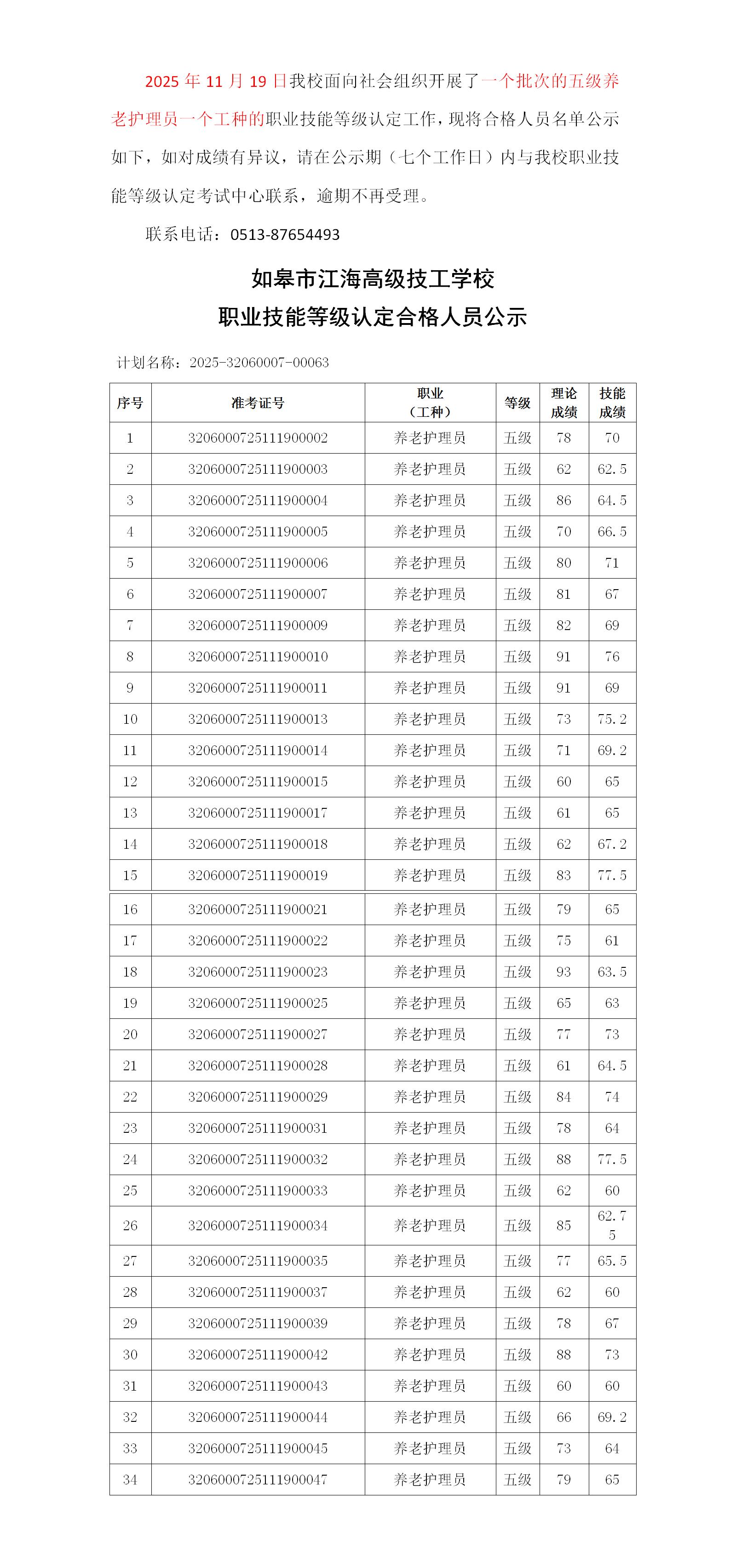 2025-32060007-00063批次職業(yè)技能等級認定合格人員公示