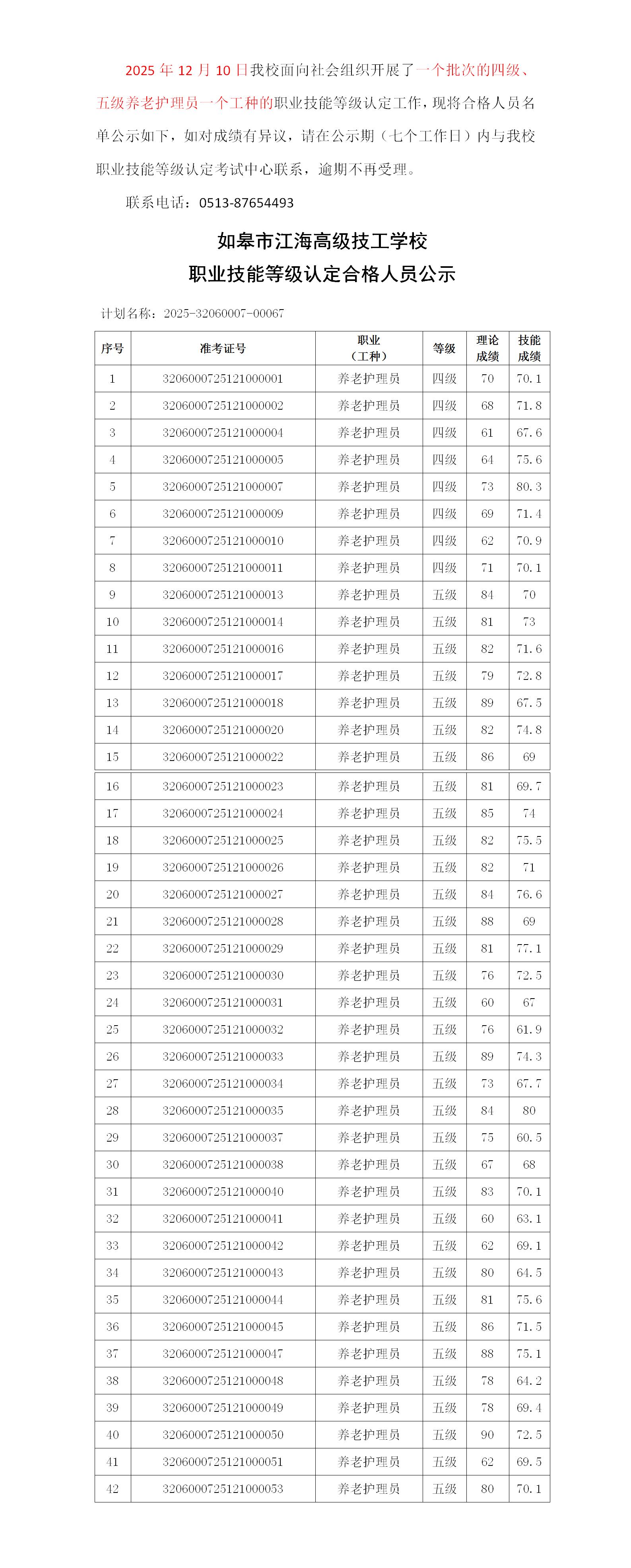 2025-32060007-00067批次職業(yè)技能等級認定合格人員公示