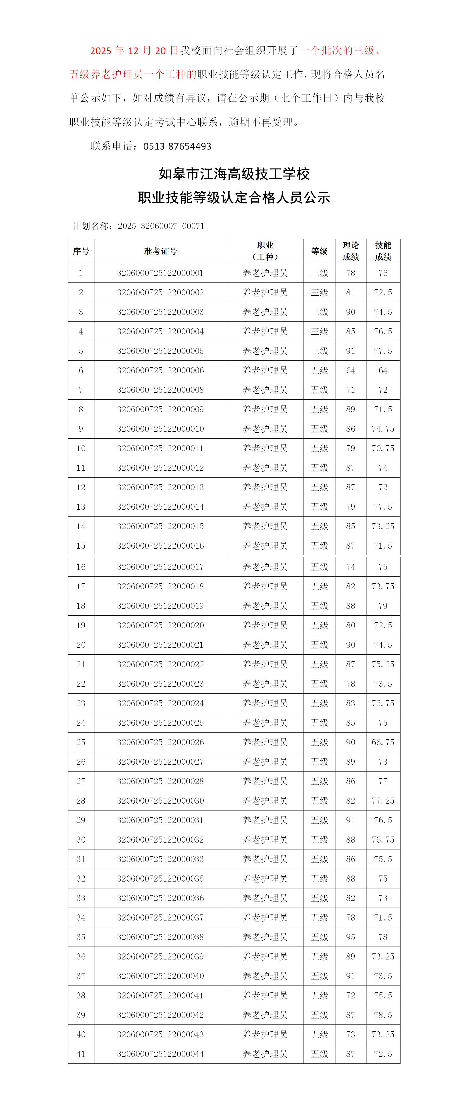 2025-32060007-00071批次職業(yè)技能等級(jí)認(rèn)定合格人員公示