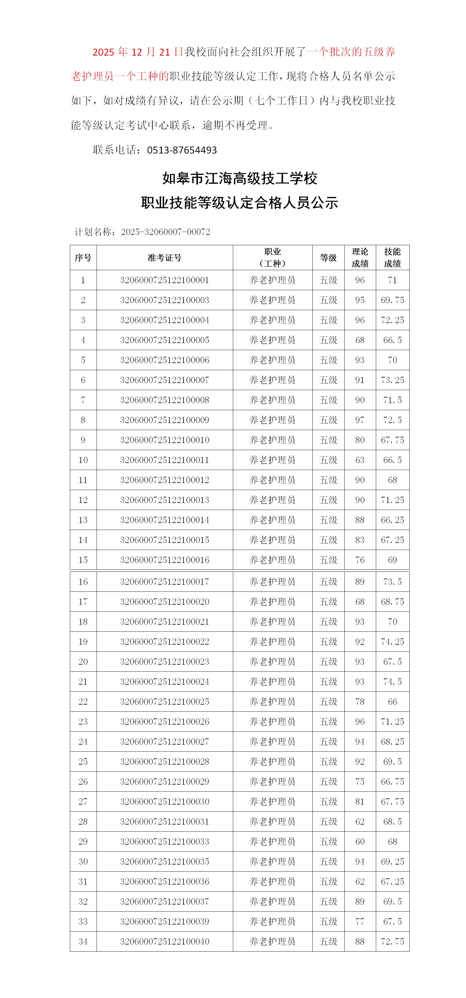 2025-32060007-00072批次職業(yè)技能等級認(rèn)定合格人員公示